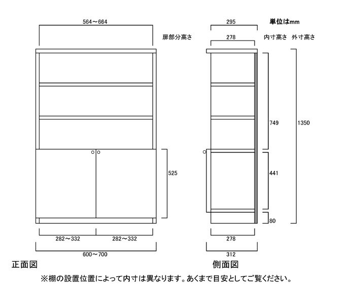 商品仕様 ■タイプ: 扉付 タフ棚板(棚板厚さ2.5cm)タイプ 両開き ■棚板耐荷重: 15kg ■外寸: 奥行31cm×高さ135cm×幅60〜70cm (幅は1cm単位でオーダーできます) ■外寸(幅): 60cm 61cm 62cm 63cm 64cm 65cm 67cm 68cm 69cm 70cm ■扉高(実寸): 52.5cm ■棚板枚数 移動固定棚板:3 共通仕様 ■材質: プリント化粧繊維板 ■塗装: ウレタン樹脂塗装 ■素材: ホルムアルデヒドの発生を最小限に抑えた基材・芯材・プリント紙・接着剤(F☆