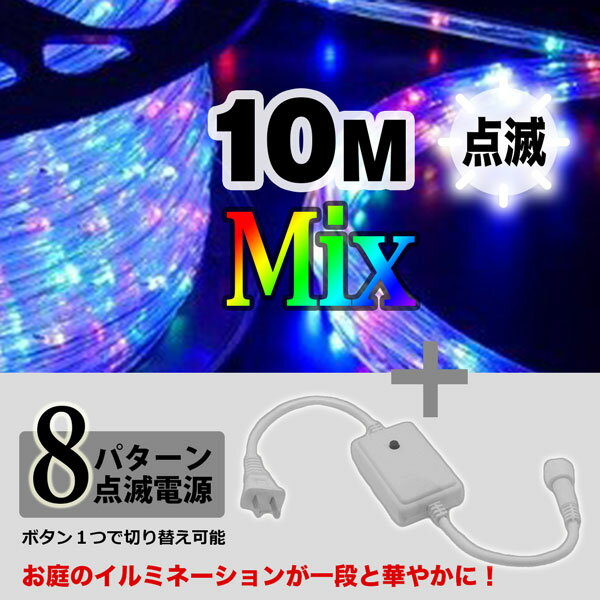 LEDロープライト 高輝度 チューブライト ミックス 10m+点滅電源セット 直径10mm クリスマス 照明 デコレーション 防水 屋外