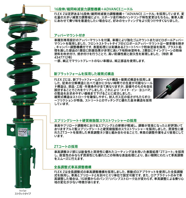この商品について 全長調整式車高調整キット / 複筒タイプ / 減衰力調整式 / 車種別マウント付き(一部車種は純正流用)■高品質を圧倒的なロープライスで実現したフルスペック車高調FLEX Zは、新たなプラットフォームの採用により、全長調整式車高調整+減衰力調整+アッパーマウント付属と、求められる機能を網羅しながらも、このクラスでは驚異的な低価格を実現しました。